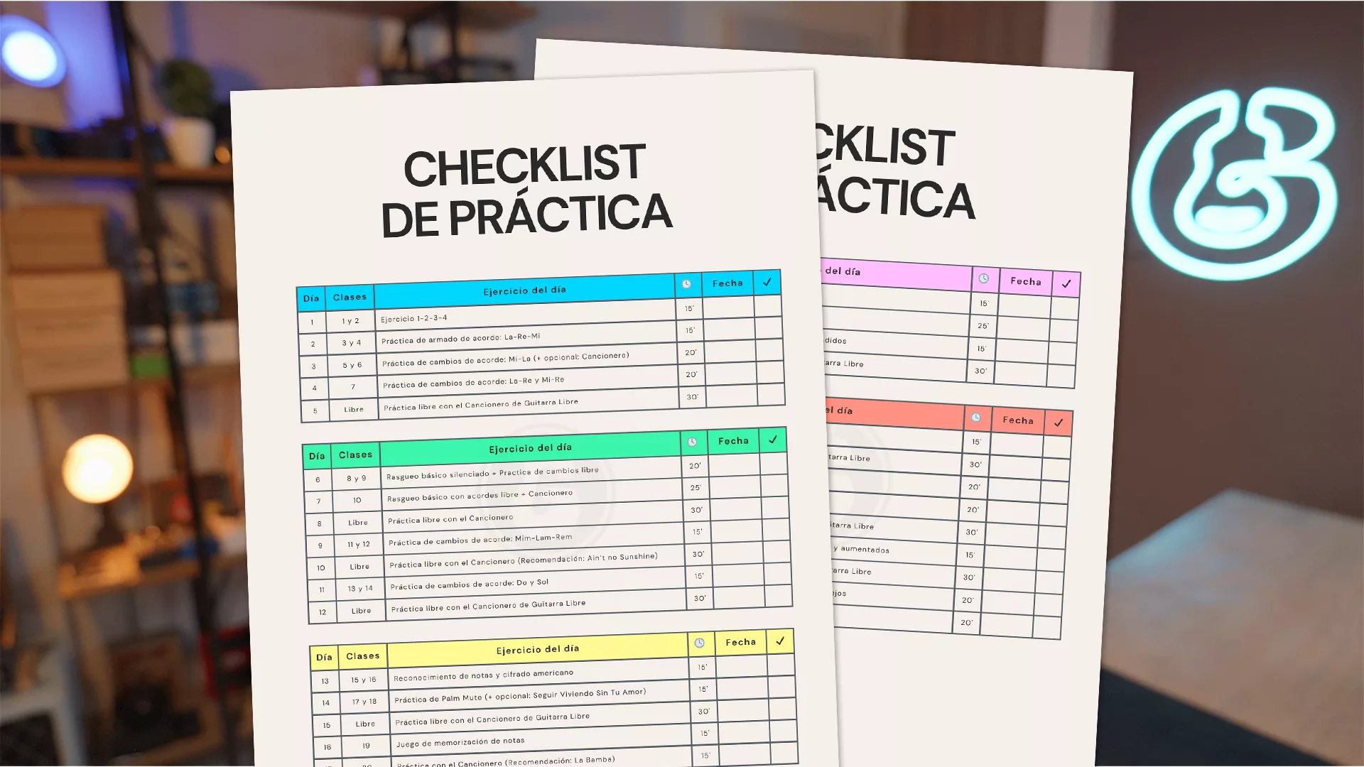 Para que nunca te sientas perdido y sepas qué practicar, cómo y por cuanto tiempo, vas a disponer de un checklist que te va a indicar los ejercicios de cada día de práctica. Siempre con un máximo de 30 minutos de práctica por día, para quienes quieren aprender pero no disponen de mucho tiempo para dedicarle.